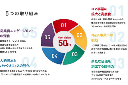 最後は、当社が中長期目標として掲げている「Next Vision 50th」における5つの取り組みについて、各担当者より説明が行