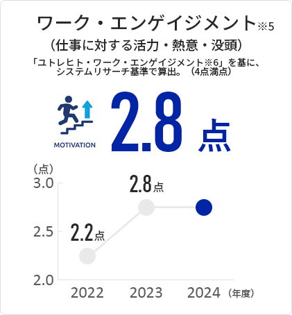 | ※5 | 従業員の心の健康度を示す概念のひとつで、仕事に対して「熱意」「没頭」「活力」の3つが揃って充実している心理状態のことです。 |